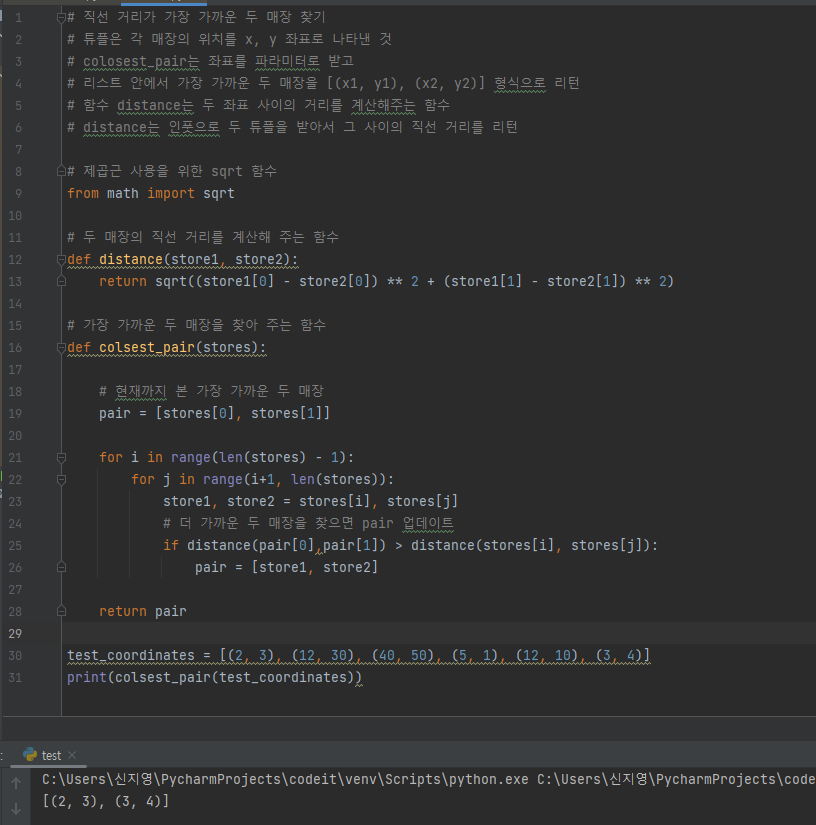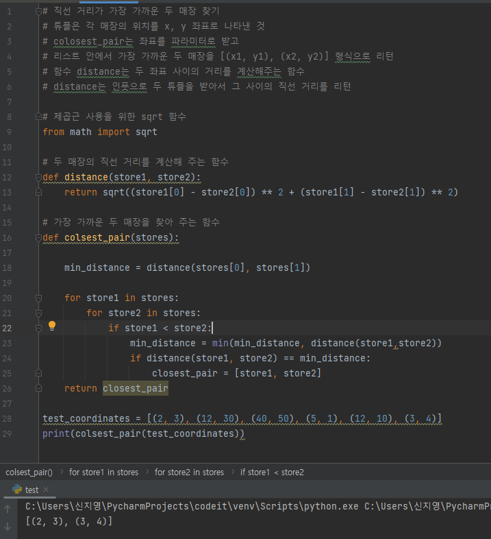 โข ๊ทธ ํ ์ต์ ๊ฑฐ๋ฆฌ์ธ ๊ฐ๊ฒ๋ค์ ์์น ๊ฐ์ ์ถ์ถํ๊ธฐ ์ํด ์กฐ๊ฑด๋ฌธ ์ฌ์ฉ. store1๊ณผ store2 ์ฌ์ด์ ๊ฑฐ๋ฆฌ๊ฐ ์ต์ ๊ฑฐ๋ฆฌ์ผ ๋ closest_pair์ store1, store2 ์ ์ฅ ํ ๋ฐ๋ณต๋ฌธ์ด ๋๋๋ฉด closest_pair ๋ฆฌํด