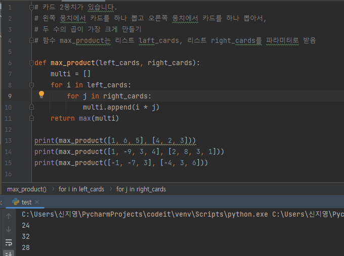 len(left_cards)๋ฅผ n, len(right_cards)๋ฅผ m์ด๋ผ๊ณ ํ์ ๋, ํจ์ max_product์ ์๊ฐ ๋ณต์ก๋๋ O(mn)