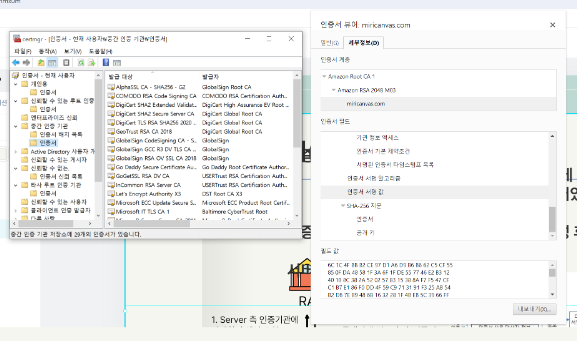 3. ν΄λΌμ΄μΈνΈλ μλ²κ° μ 곡νλ μΈμ¦μλ₯Ό κ²μ¦νκΈ° μν΄ μλμ°/λΈλΌμ°μ μ μ€μΉλ μΈμ¦κΈ°κ΄μ μΈμ¦μμ 곡κ°ν€λ₯Ό ν΅ν΄ μλ²κ° μ 곡νλ μΈμ¦μμ μ μμλͺ μ 볡νΈννμ¬ μΌμΉμ¬λΆλ₯Ό νμΈν©λλ€.