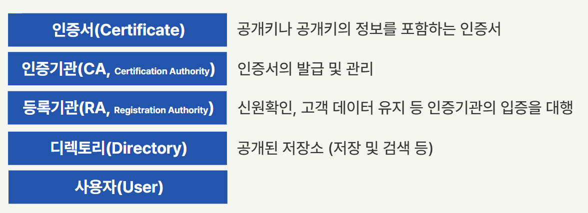 PKIλ μΈμ¦μ(Certificate), μΈμ¦κΈ°κ΄(CA), λ±λ‘κΈ°κ΄, λλ ν λ¦¬λ‘ κ΅¬μ±λ©λλ€.